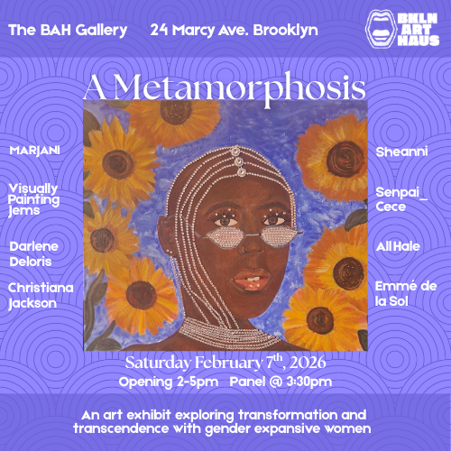 An art exhibit exploring transformation and transcendence with gender expansive women at the BAH Gallery in Black and Women's History Month.A Metamorphosis is an art exhibit and conversation with gender expansive women about the transformative and transcendent moments in women's lives. “Transform yourself to transform the world” a quote spoken by prolific author, activist, philosopher and feminist Grace Lee Boggs encapsulates the urgency and essence of this exhibit. We're interested in how unique identities and perspectives tell a story of metamorphosis.In this time of political and social unrest reclaiming, exploring and naming our journeys is a practice for the revolution. So often women are asked to mask the times of questioning, reflection, joy, pleasure, all the messy parts that encapsulate all of who we are. We want and need to see our whole selves represented in society. Abolitionist educator Bettina Love says, “ For many dark folx, art is a homeplace, art is where they find a voice that feels authentic and rooted in participatory democracy."This exhibit gives us the incredible opportunity to celebrate both Black History Month and Women’s History Month through an intersectional lens and observe the ways art gives us a platform to reflect on the beauty and complexity in this life. Emphasising the expansion of womanhood and depth of cultural diversity in this beautiful city; we aim to highlight the moments of rebirth, evolution, resilience, transcendence and so much more.Featured Artists include: MARJANI, Visually Painting Jems, Darlene Deloris, Sheanni, Senpai_Cece, All Hale, Emmé de la Sol, Christiana JacksonCureated by Brianna FreemanOpening: Saturday, February 7th at 2pmShow Run: February 7 - March 28, 2026Closing: March 28 at 2pm